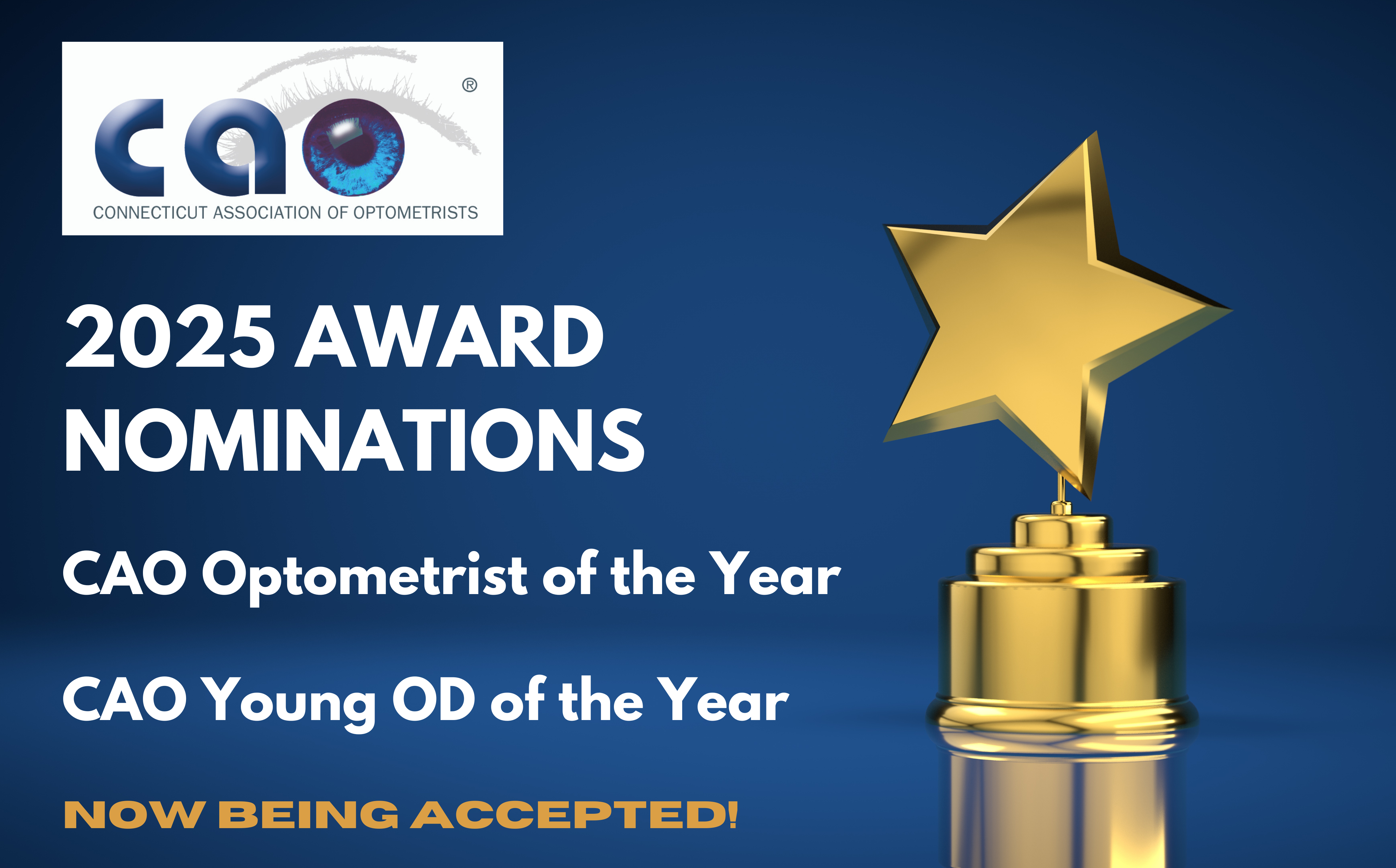 Award Nominations tOptometrist of the Year AwardThis professional service award recognizes an individual for outstanding participation and contributions to organized optometry and his or her community. It is intended that this award be used to indicate one person whose cumulative service up to the time of presentation exemplifies the tradition of unselfish service for the betterment of his or her profession and community. Young Optometrist of the Year AwardA young Optometrist is defined as those who have been in practice for 10 years or less, and who have showed remarkable leadership skills when serving their profession, patients and community. Criteria that should be considered when choosing an individual for either award: Service to Optometry, Service to the Visual Welfare of the Public, Public Service, and Service to CAO and/or AOA. Awards are presented at the Annual CAO Spring Training Event on Sunday, March 22, 2026.